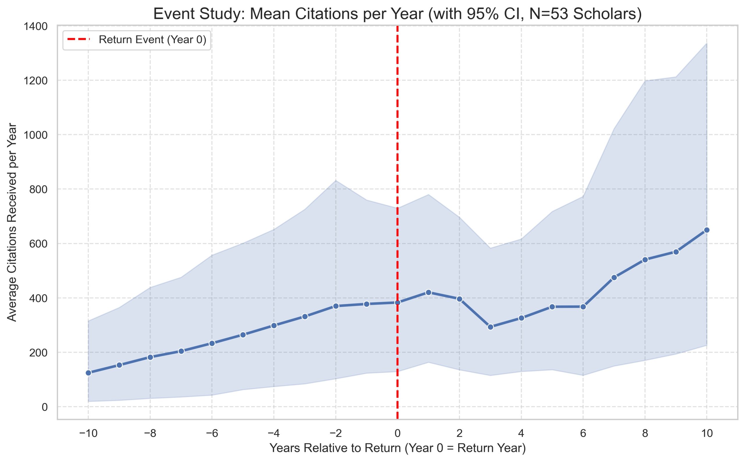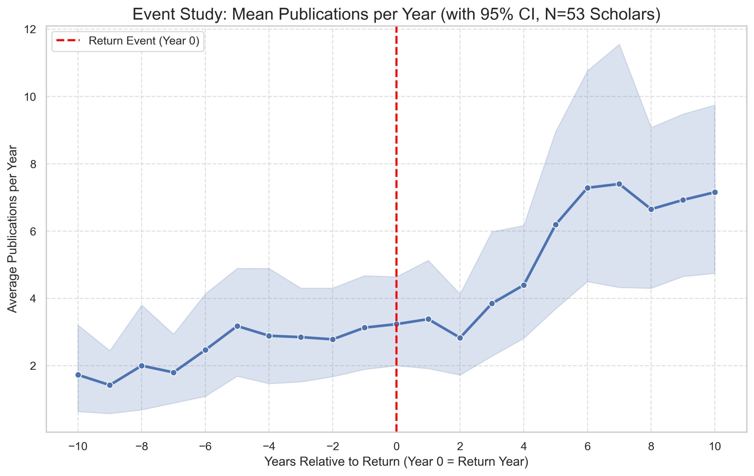 Figure 3: Average publication and citation trends relative to the year of return