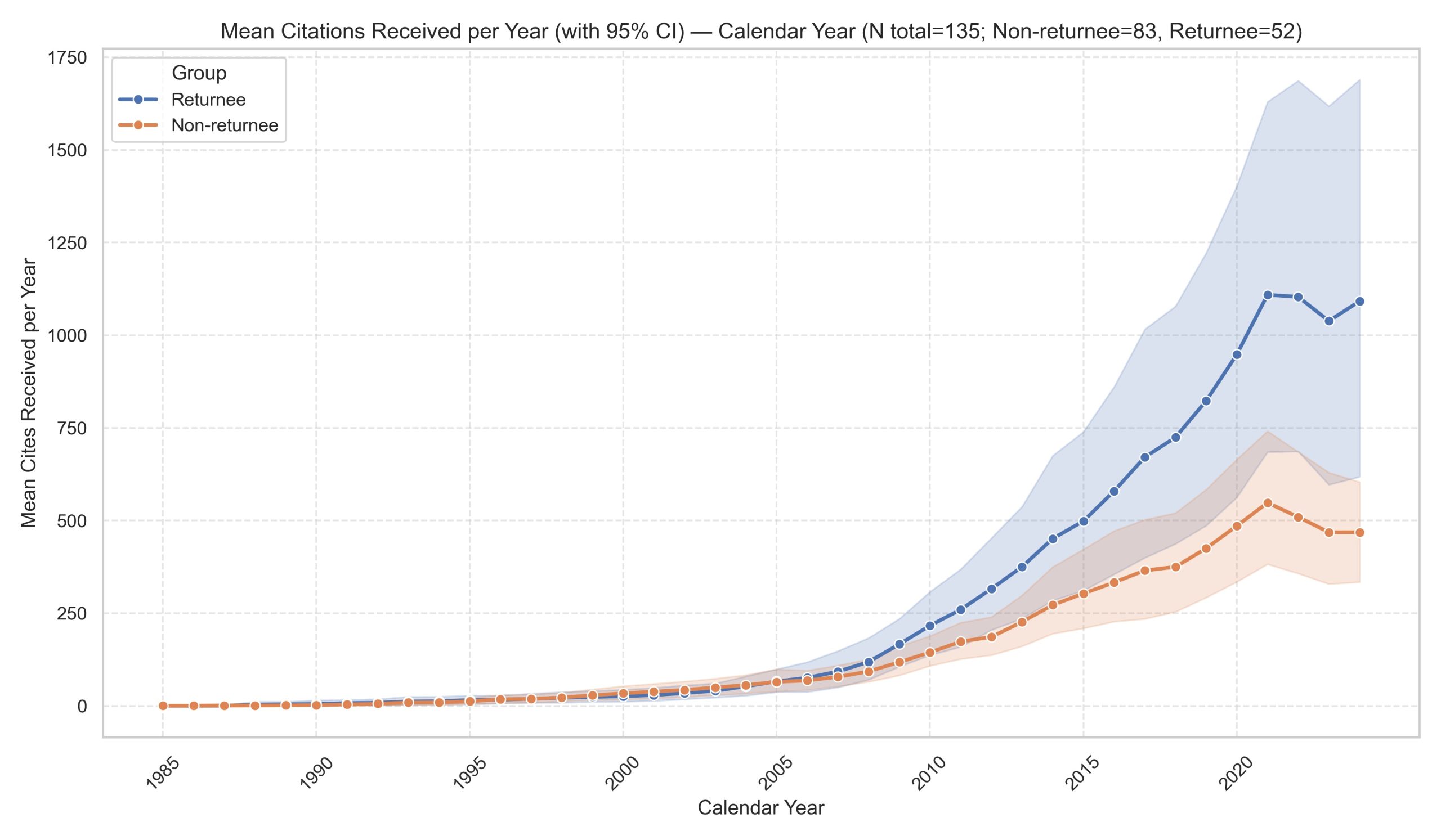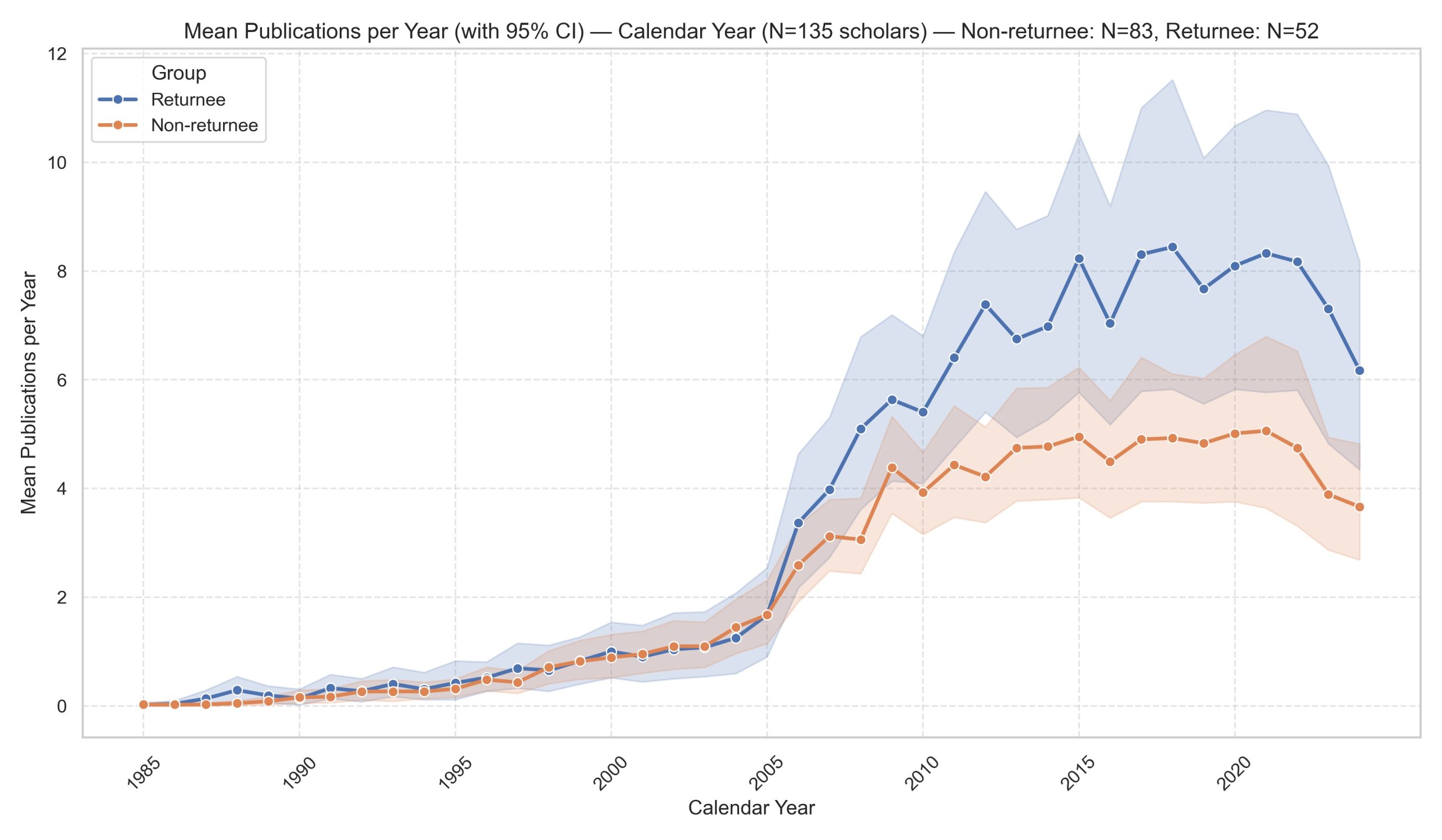 Second, since 2005, the cohort of returned alumni has consistently outpaced non-returnees in yearly publications and citations;