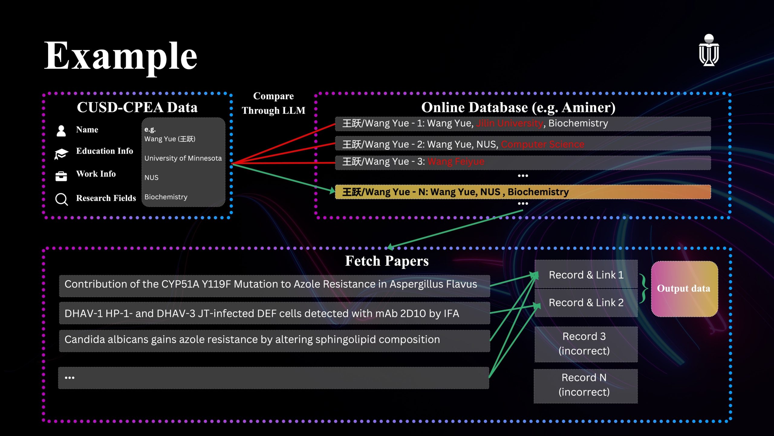 First, we extract basic personal information from the CUSD-CPEA data, including name, education, work experience, and research interests. Second, we use the AMiner public API to identify the correct alumni we want to find. After that, we extract their high-citation papers and identify their multiple profile pages in Web of Science. Finally, we manually export the data for further analysis. An example for Professor Wang Yue can be seen in Figure 1.
