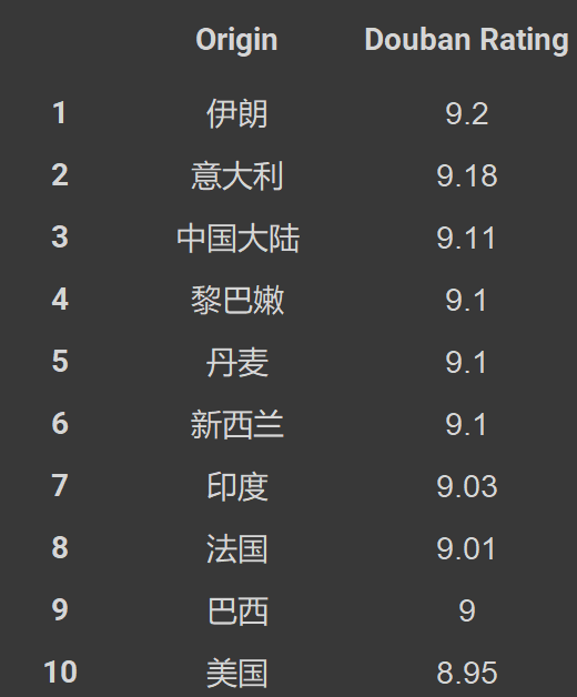 Movies from Iran have the highest ratings among the top 250 movies on Douban, followed by Italy and Mainland China