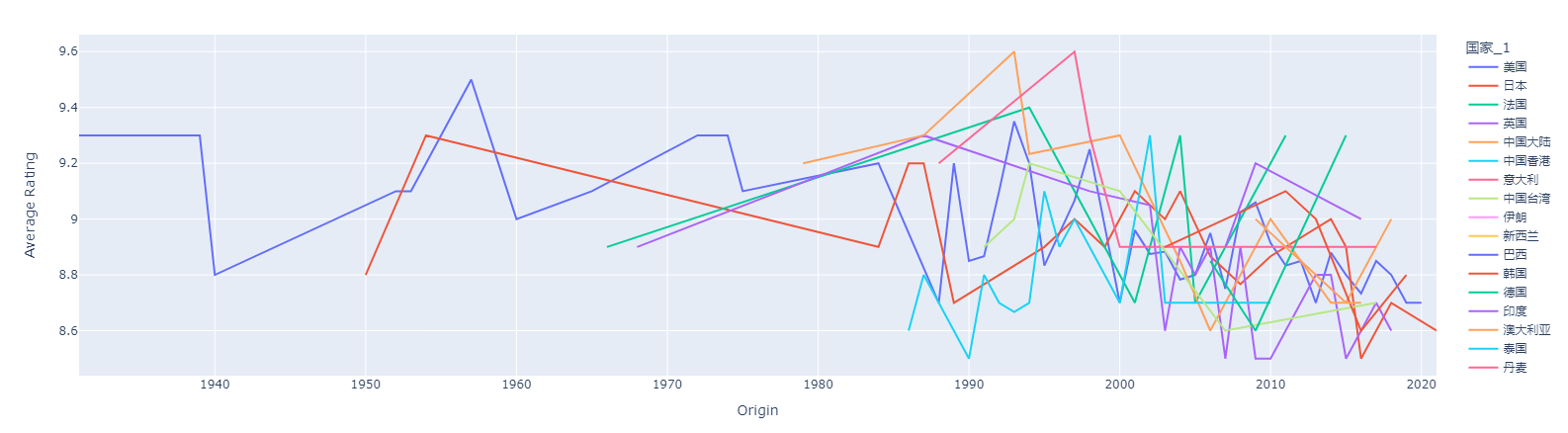 From the graph, we can observe that Italian movies around 1993 have the highest ratings, followed by Mainland China movies around 1998, and American movies around 1955